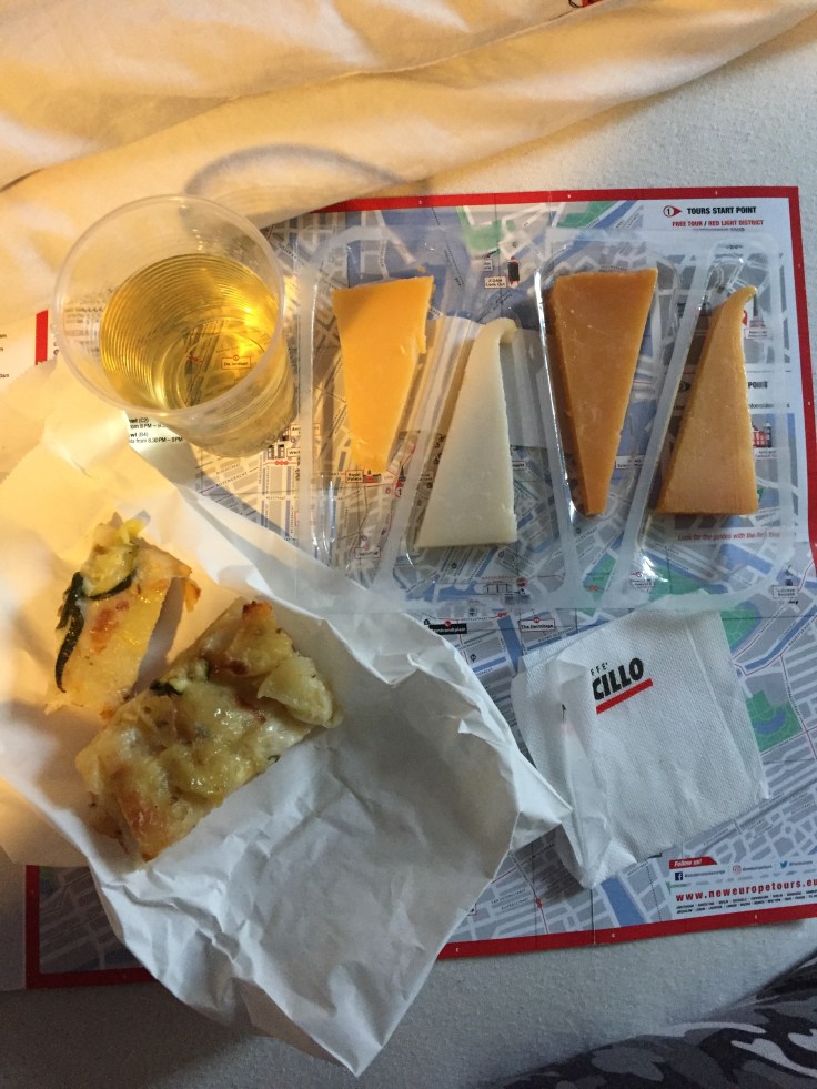 I took a canal boat ride and went “home” to have a picnic (potato/zucchini pizza, cheese and wine with a map of Amsterdam as my table cloth: