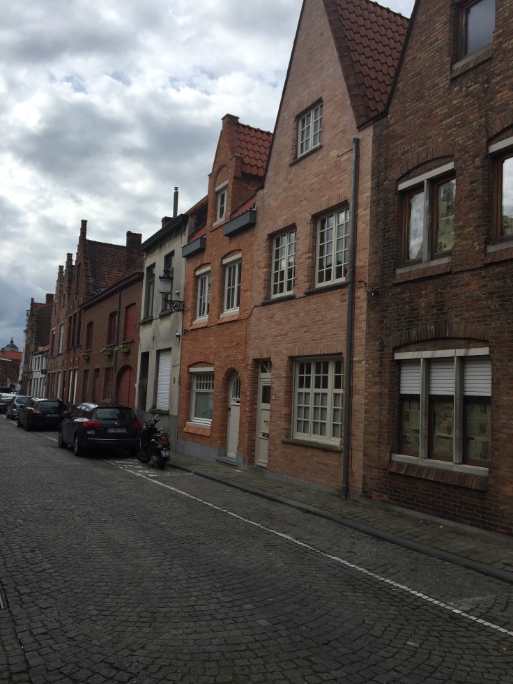 In Bruges, I figured out how to buy bus tickets and take the bus to my designated stop.  When I got off the bus I turned the wrong way and because Bruges is desolate compared to Amsterdam, I probably walked 1/2mile until I saw a lady.  After about 5 minutes of her speaking Flemish to me, I figured out my mistake.  This whole place is cobblestones and with my suitcase in tow,  I turned around and went “clackity clack” down the street to the correct house.  The one beside the motorcycle.  Those are my windows up on the second floor.
