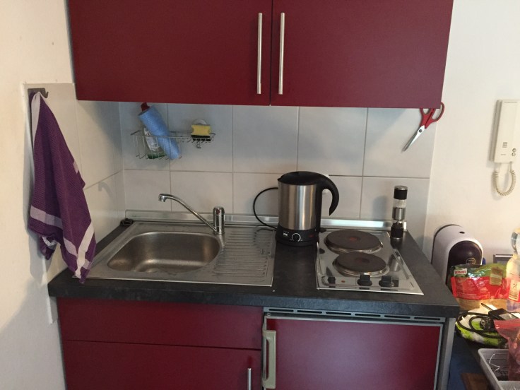 I slipped between the raindrops, took an interesting bus tour through Cologne (during rush hour), went grocery shopping and ended my day in my studio apartment just four blocks from the Cathedral. Here is my little kitchen: