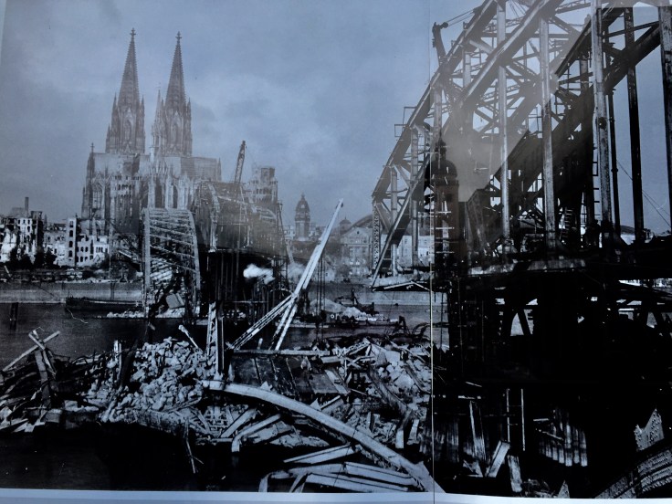There are 250 churches in Munich which all seem tiny. They had a photo exhibit showing Munich in 1947. Here is the bridge over the Rhine leading to the Cathedral. Unbelievable the church was still standing.