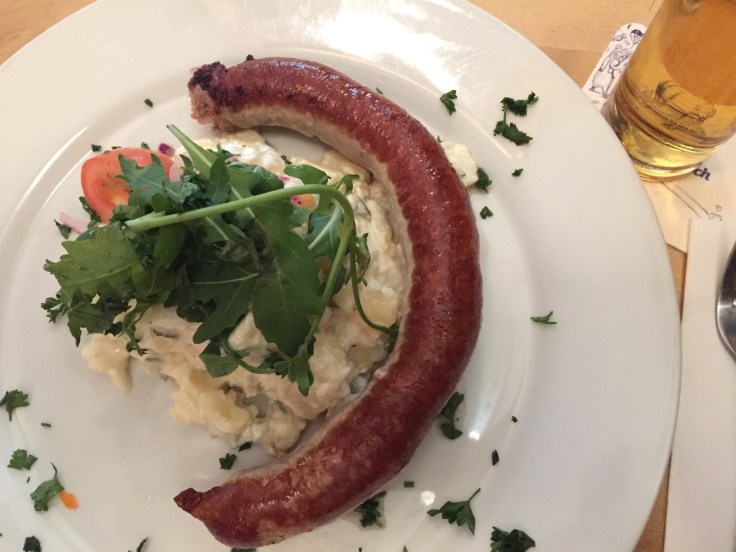 I have traded French fries for sausage– this was Friday’s lunch( tasty and the potato salad had chopped pickles):