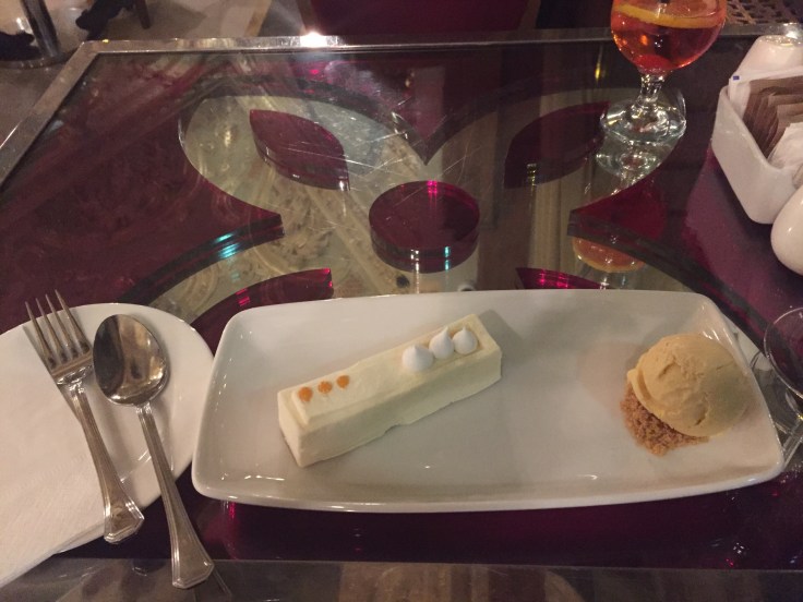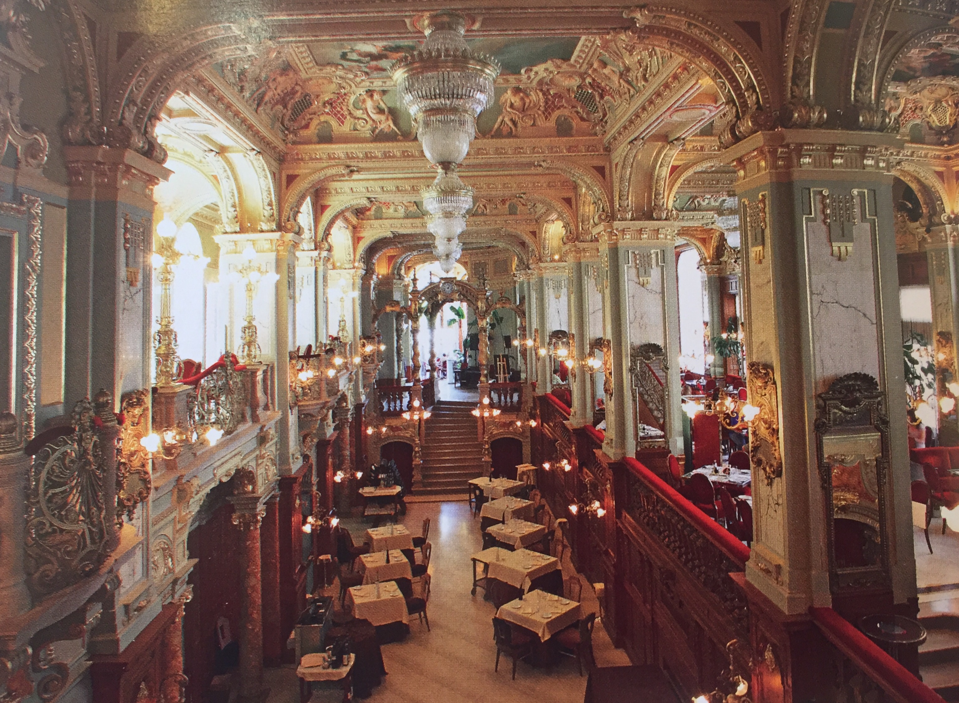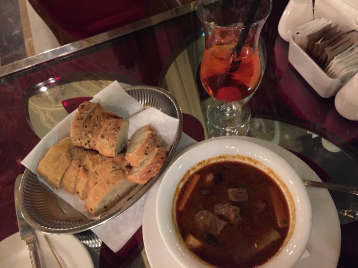 For dinner, I headed to the New York Cafe. This restaurant had been build in the early 1900’s— looks more like Paris than NYC. I had some Golash Soup and cheesecake with an apricot center and apricot ice cream for dessert: