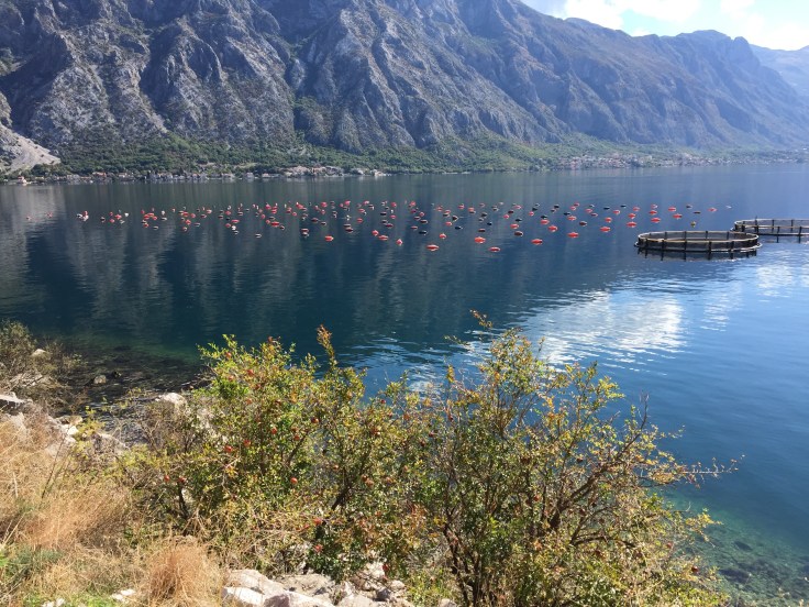 I liked the mussel/fish farms along the shores. The tree in the foreground is a pomegranate tree: