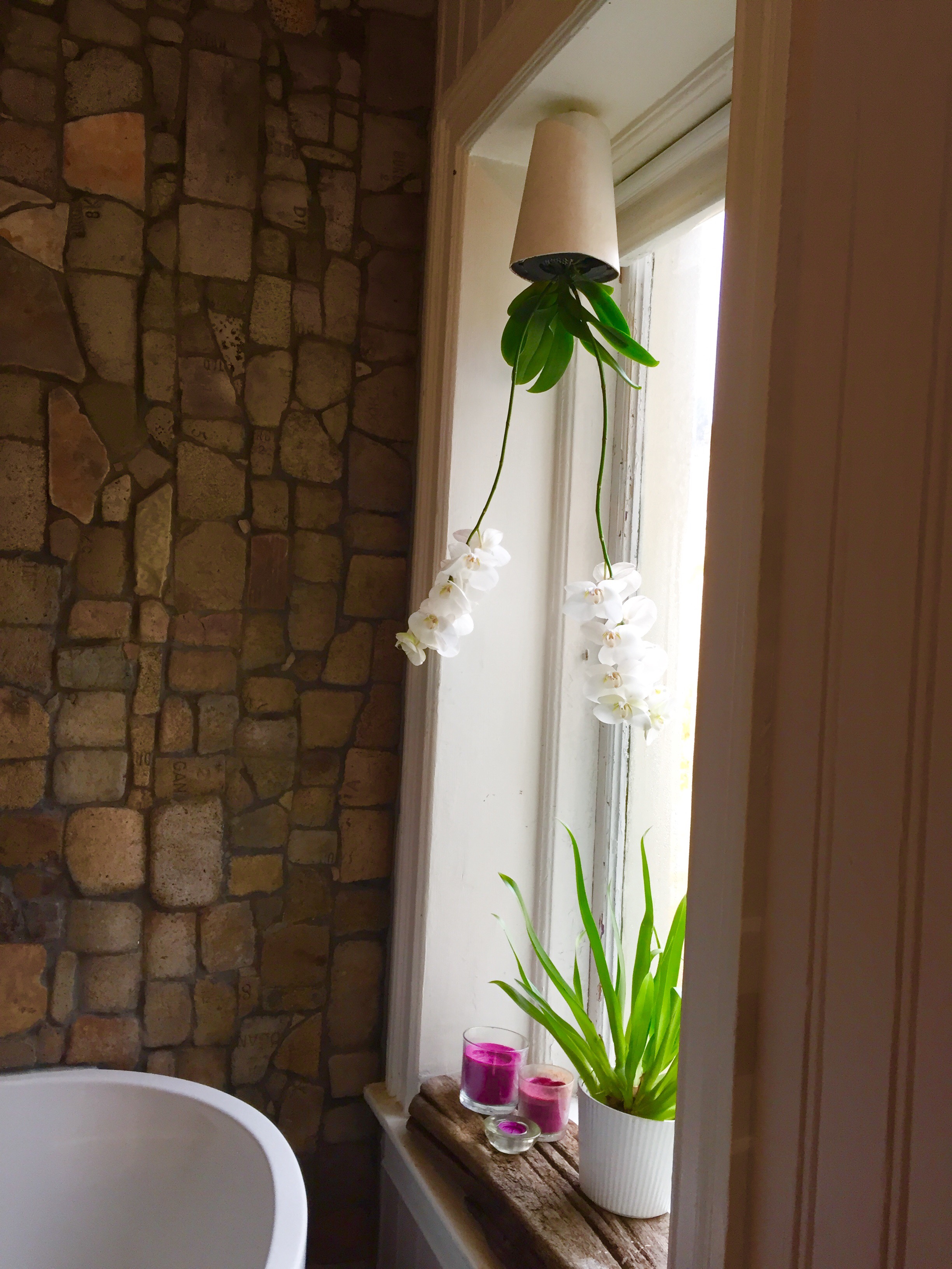 My place was about a ten-minute walk from the train station. The en-suite room I have is in a flat on the 5th floor of a building built in 1896. No elevator– thank god for teenagers. The daughter of my host carried my suitcase up the 76 steps (it would have taken me three days). This is an orchid I have growing upside down in my bathroom: