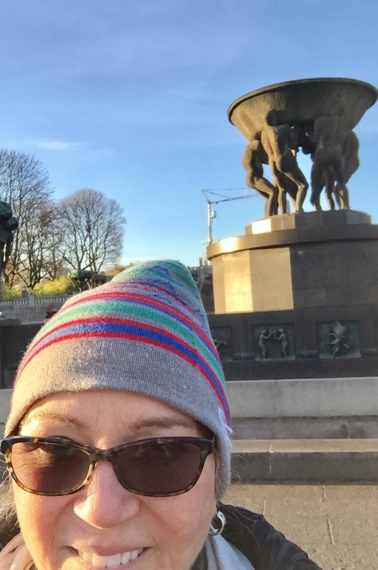 After a break and lunch (cauliflower wings and a glass of Guinness at the Hard Rock Cafe for $33) I was on to my next adventure. This involved buying a transit pass and finding my way out of the center of Oslo to a very famous sculpture garden. At the metro, I was directed by the “official info person” to “go out of the metro, turn right and take the tram”. Of course, nothing could be that simple, but I’m on to them and I had the name of where I wanted to go written on a “cheat” sheet and I showed it to folks along the way and found the tram I was supposed to take. ( I think this puzzle of finding where I want to go is something I’m going to miss at home).