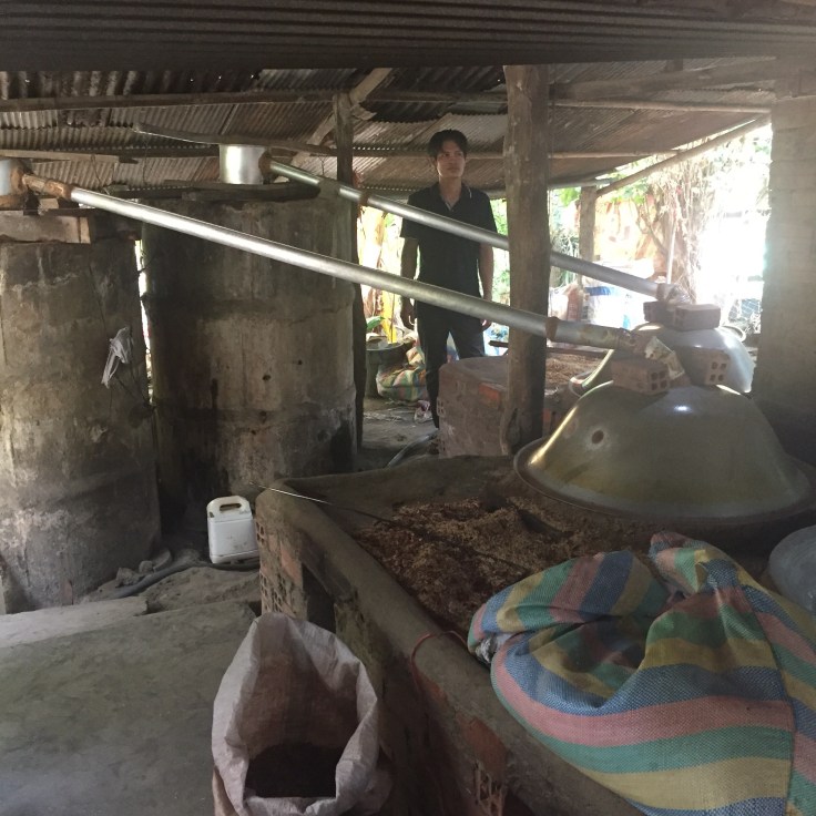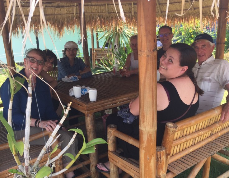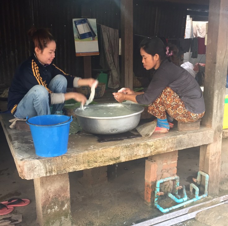 Wednesday morning we had a choice to ride a bike on the roads with motorcycles and cars for 20 kilometers in 94 degrees or take a Tuk Tuk to visit local businesses. It was a “no-brainer” for me. We visited a rice paper shop. These are used to make spring rolls. This family makes about 1500/day. A pack of 100 sells for $1.50. The family nets about $7 a day: