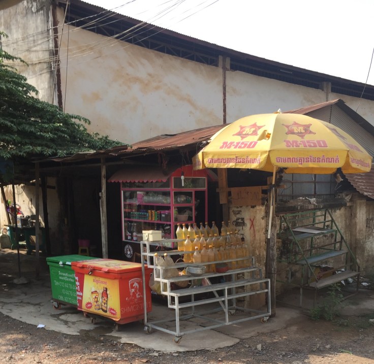 After a long van ride (8 hours with coffee breaks and lunch stop) we made it to the second biggest city in Cambodia–population 500,000. The two-lane road was paved and I can’t figure out why it was so bumpy. I couldn’t look out the front window because every time I did I was convinced we were going to have a head on wreak. Along the entire road were rice fields and store shacks/stalls–all selling the exact same things. The rice paddies were dry because planting begins in July for harvesting October to December. Rice is Cambodia’s only export.