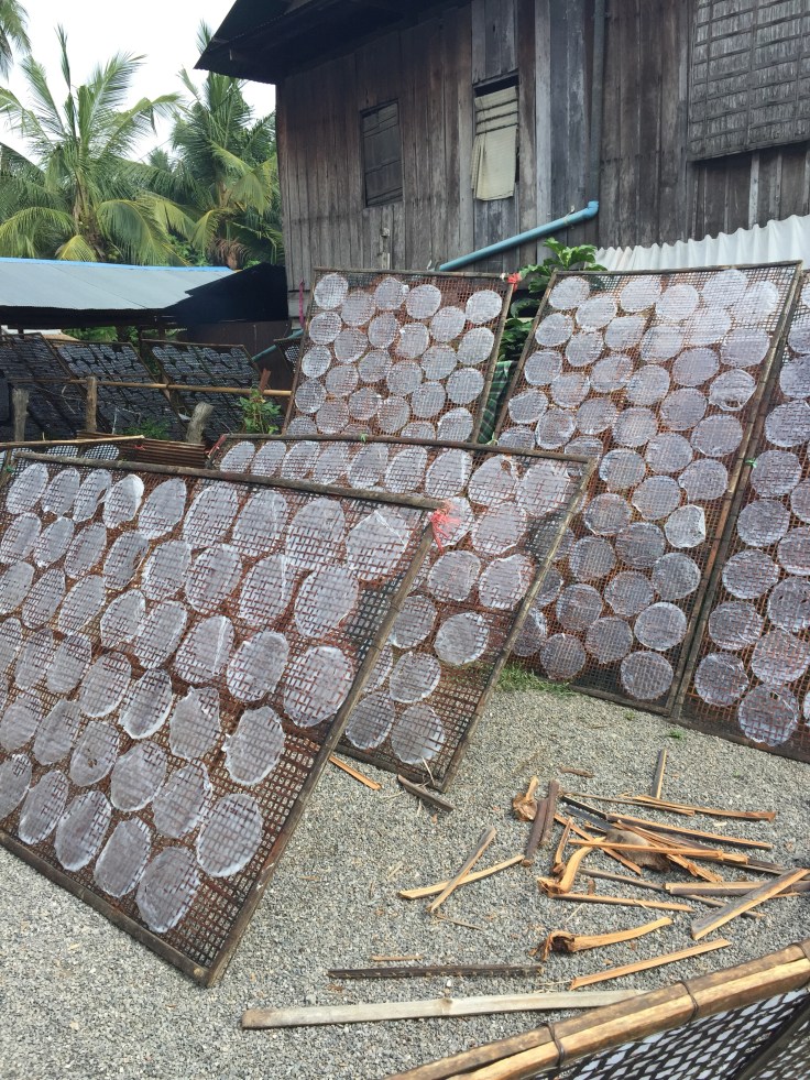 Wednesday morning we had a choice to ride a bike on the roads with motorcycles and cars for 20 kilometers in 94 degrees or take a Tuk Tuk to visit local businesses. It was a “no-brainer” for me. We visited a rice paper shop. These are used to make spring rolls. This family makes about 1500/day. A pack of 100 sells for $1.50. The family nets about $7 a day: