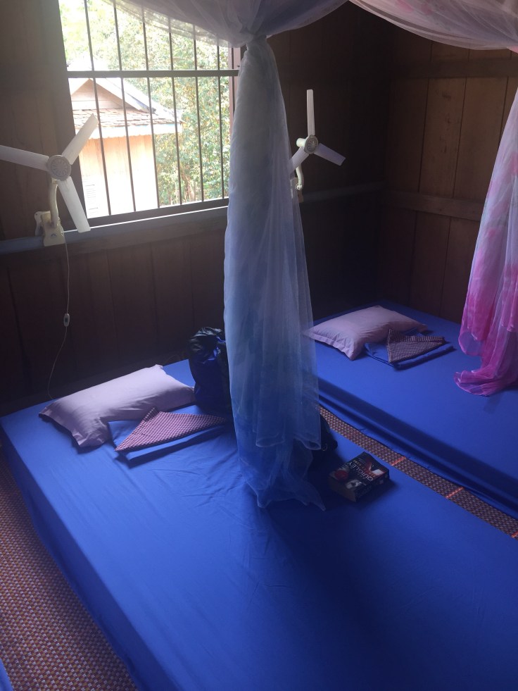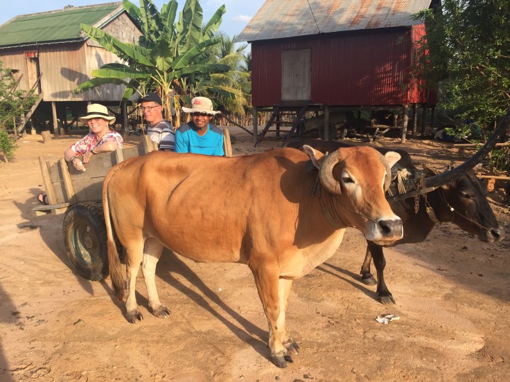 We were overnight guests of a local rural family. The house had solar powered lights and bed fans. The sleeping area was on the second floor and really quite comfortable. After you opened your mosquito netting it felt rather private (I haven’t seen a mosquito yet). I was cool enough that I didn’t need the bed fan. The first floor had a dirt floor, the dining area, and bathrooms (the toilet flushed manually with a pot of water). It worked well and we were treated like special guests with an ox cart ride before having a delicious dinner–pumpkin with minced pork, beef with red tree ants (Cambodians have taken the art of eating strange things to a whole new level), lemongrass with garlic, beef soup with potatoes, homegrown rice, mangoes and bananas.