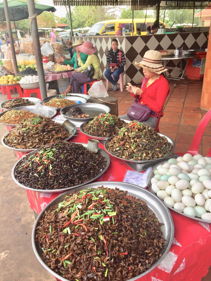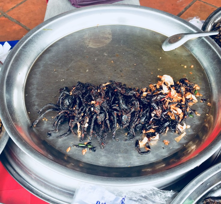 After breakfast, we were on our way to the south–a seven-hour minibus ride. We stopped along the way at a local market selling bugs, etc. l tried the tarantula and surprise, surprise it tasted like bbq chips. There were other bugs and frogs but I passed on those delicacies: