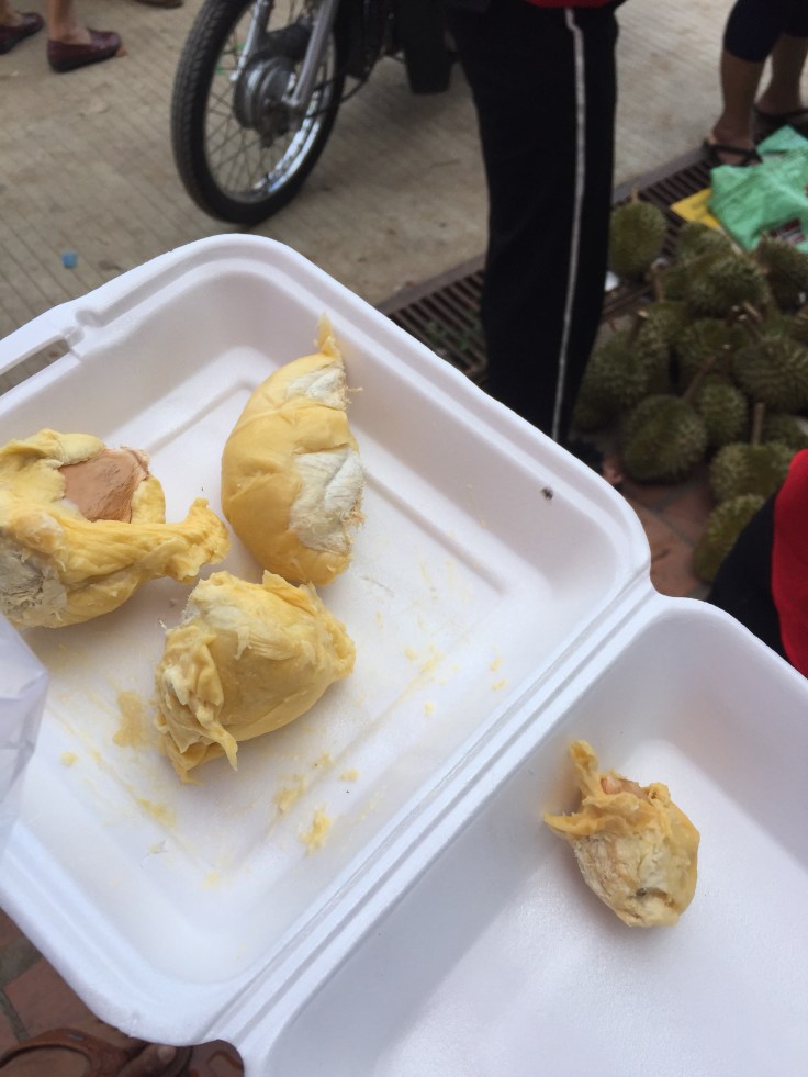 When we arrived in Kampot, we did a walkabout in the market. We had some local fruit and tried a Durian. This is reported to be “bad/smelly” tasting. It tasted like cantaloupe. I found I disliked the texture more than the smell.