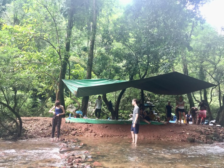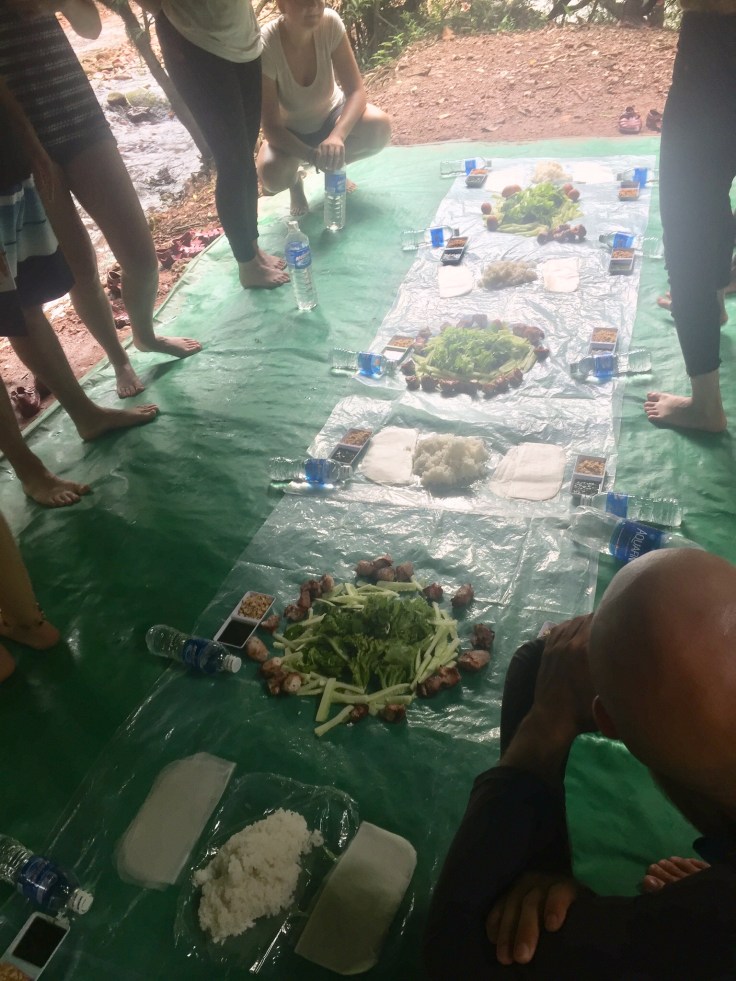 Our next adventure was a 45 minute trek into the jungle. Doesn’t sound too bad except for the 30 foot single track steep dirt hill in and out. The guide held on to me and I was glad for his help. After our march in the jungle we came to a clearing by a cute little creek where some other guides had cooked lunch. We had casual eating with piles (on the floor) of rice paper rolls and ingredients: grilled pork and tofu, lettuce, cukes, bean sprouts, rice, peanuts and the best ground ginger and coriander sauce—yummy.
