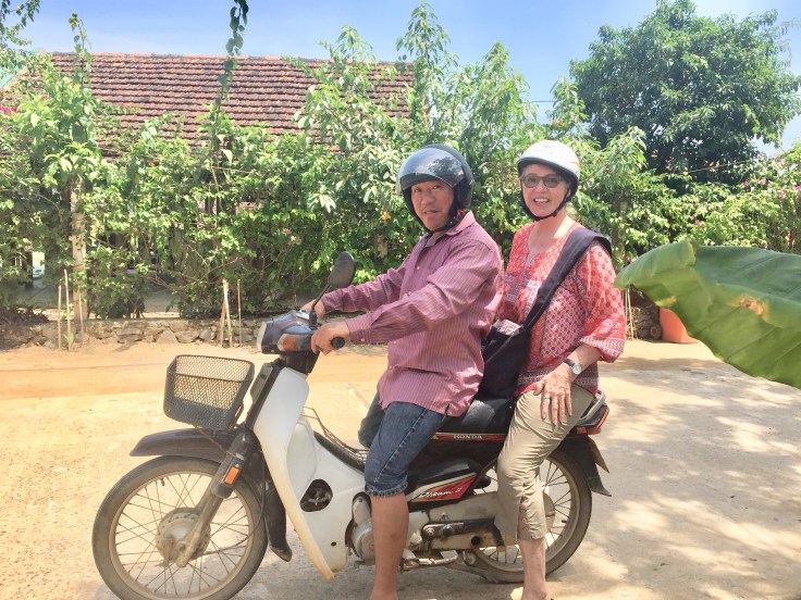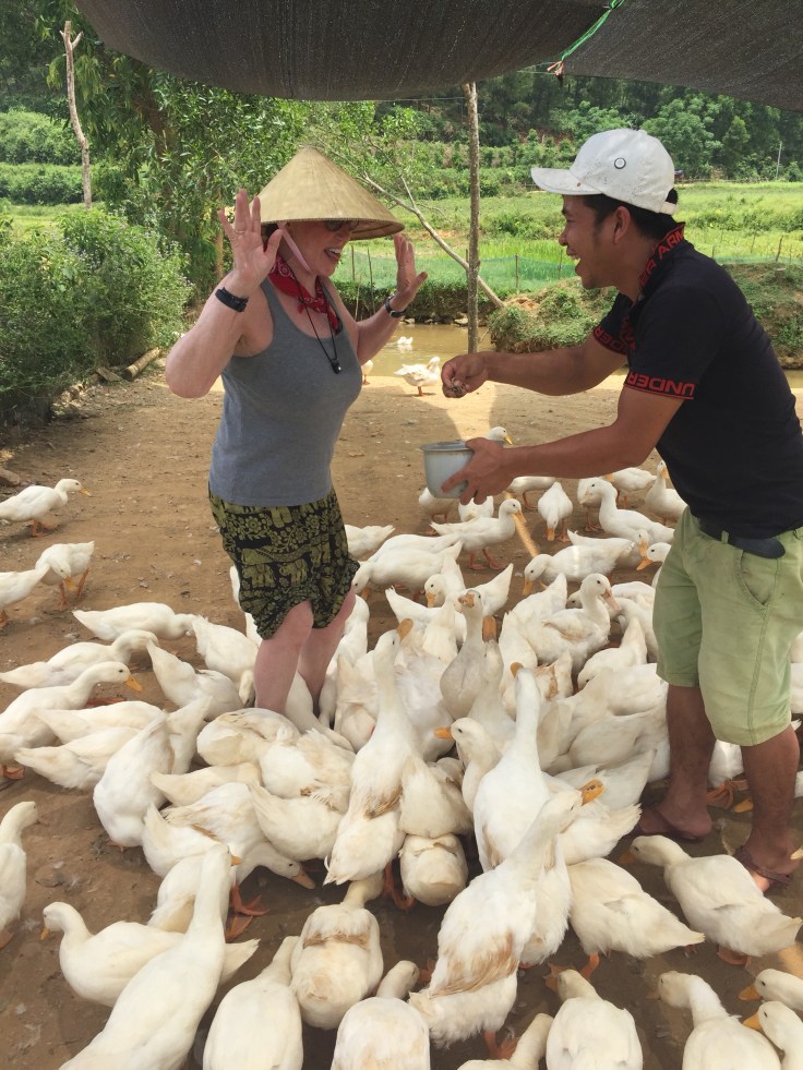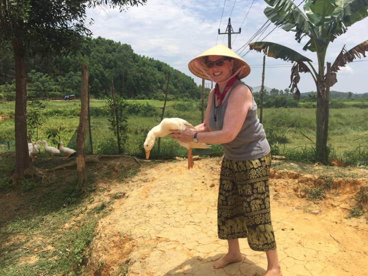 After all that duck excitement I biked on to The Pub With Cold Beer– my kind of place. I could have taken a swim in the river but it was too hot to put my suit on so I ditched the bike and took a motorcycle ride back to my hotel for a lunch of rice papers filled with noodles and prawns, chili sauce and glass of white wine at the swimming pool. What a wonderful way to spend 5 days in the middle of Vietnam!!!
