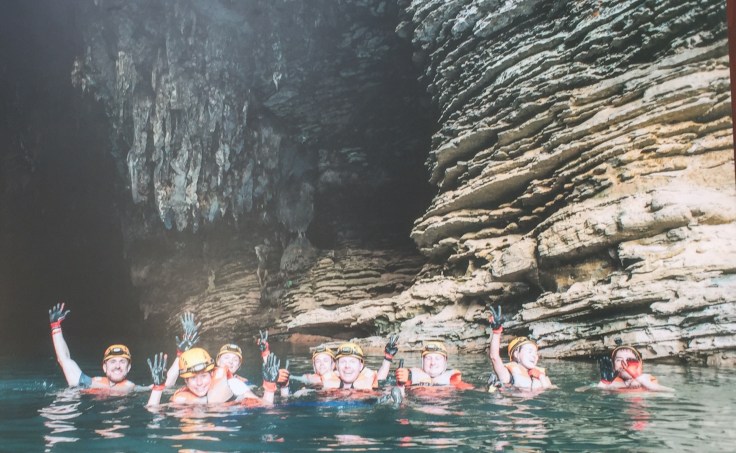 Lunch was great but this nightmare wasn’t over yet. We had to don life jackets and helmets with head lights for the next leg of the tour. This was a 600 meter swim in a pitch dark cave. The worst part was a climb over a giant pile of jagged boulders to get to the water. I thought I would fall and possibly really hurt myself. I really really hung onto the guide.