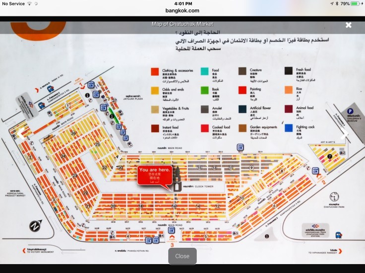 My next challenge was to navigate the subway to Chatuchak Weekend Market. The subway was air conditioned and easy to figure out. The market—another story. It is only open on weekends and has 8000 stalls over 35 acres…..if you can’t find what you want there you don’t need it! I was afraid I wouldn’t be able to find my way back to the subway. There was a Park next to the market and you could rent a lawn mat to picnic in the shade….so cool.