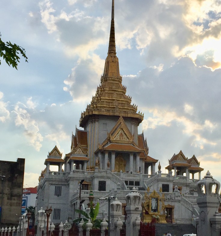 I passed Wat Traimit Temple on my walk. The main attraction at this Temple is a solid gold Buddha that was only discovered 40 years ago. It had been covered with stucco and fell from a crane while being moved to a new building–were those workers surprised. 93% of the population of Thailand is Buddhist. There are 450 temples in Bangkok and 3500 in Thailand.