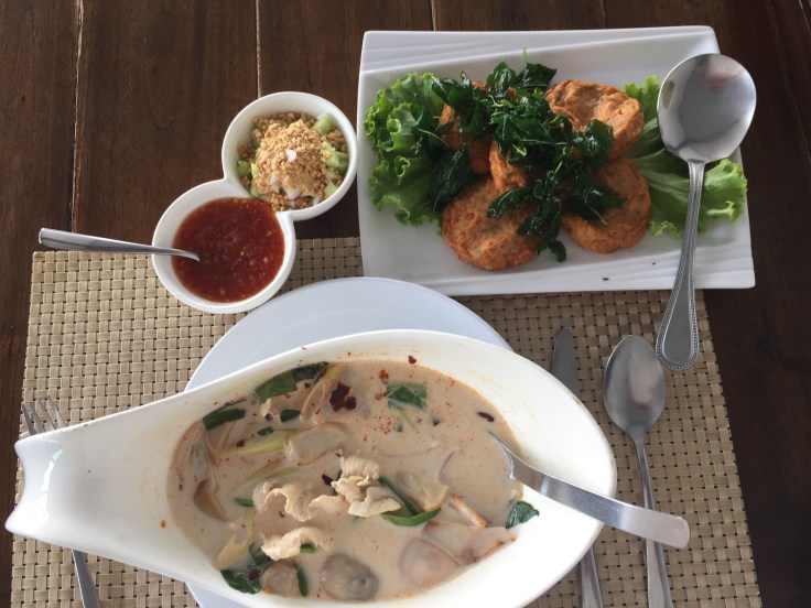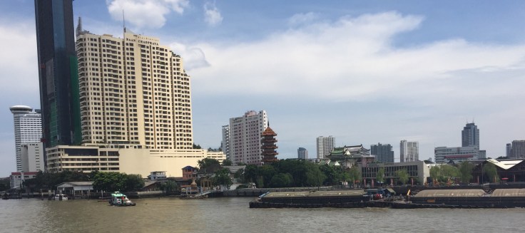 I ended my adventure with lunch of coconut chicken soup and fish cakes at a restaurant on the river–watching the barges go by. Check out the high rise buildings right next to the temple with the Pagoda.