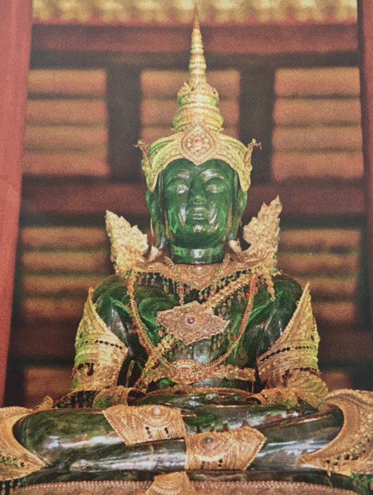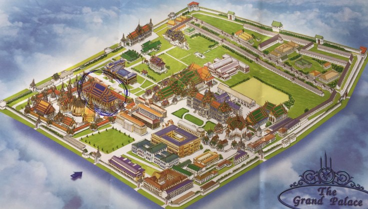 The Emerald Buddha is Thailand’s most sacred image. It is made of one piece of jade and is 31 inches tall. The King is the only one permitted to touch the Buddha and he changes the clothing three times a year– Buddha still has his winter outfit on. The Buddha lives in a giant building within the Grand Place grounds. I circled it on the map. He is high up on a stand and looks very small. My picture is in front of the King’s entrance to the temple. That is the Buddha in a glass case just over my head. No pictures inside this temple.