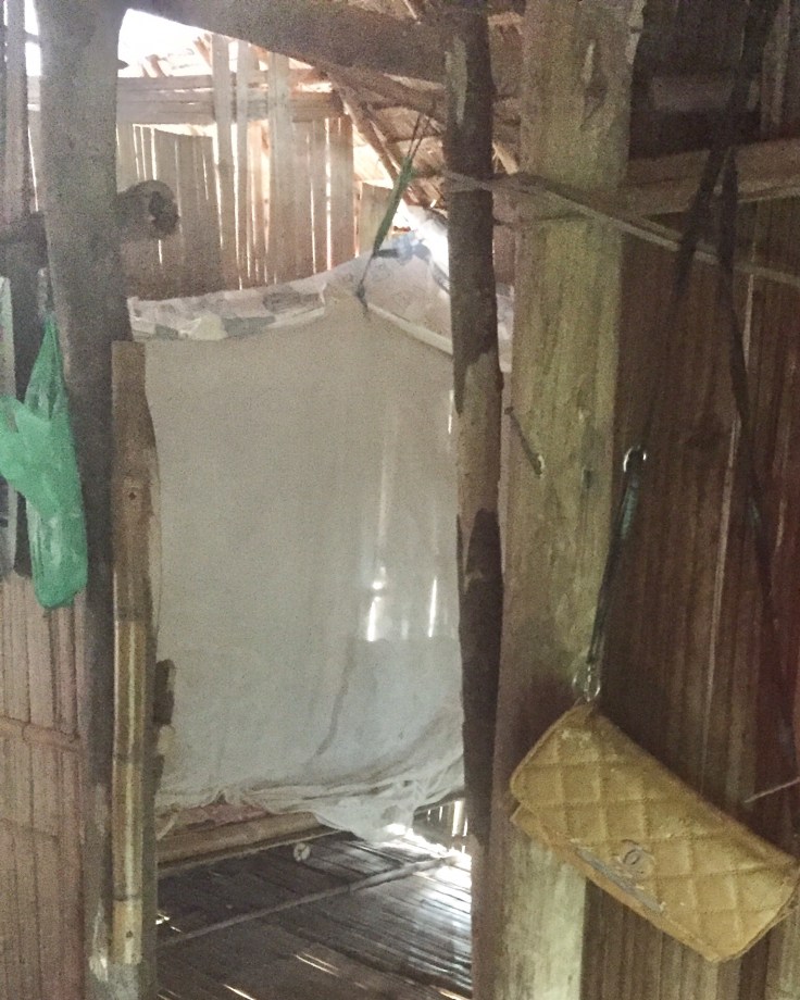 We got a look into one bamboo house in the village (the women’s that I am pictured with). The home is elevated (you could see the ground about 10 feet below through the bamboo floor) and they had a tv in the bedroom, just across from the white mosquito net. I love the Channel hand bag.