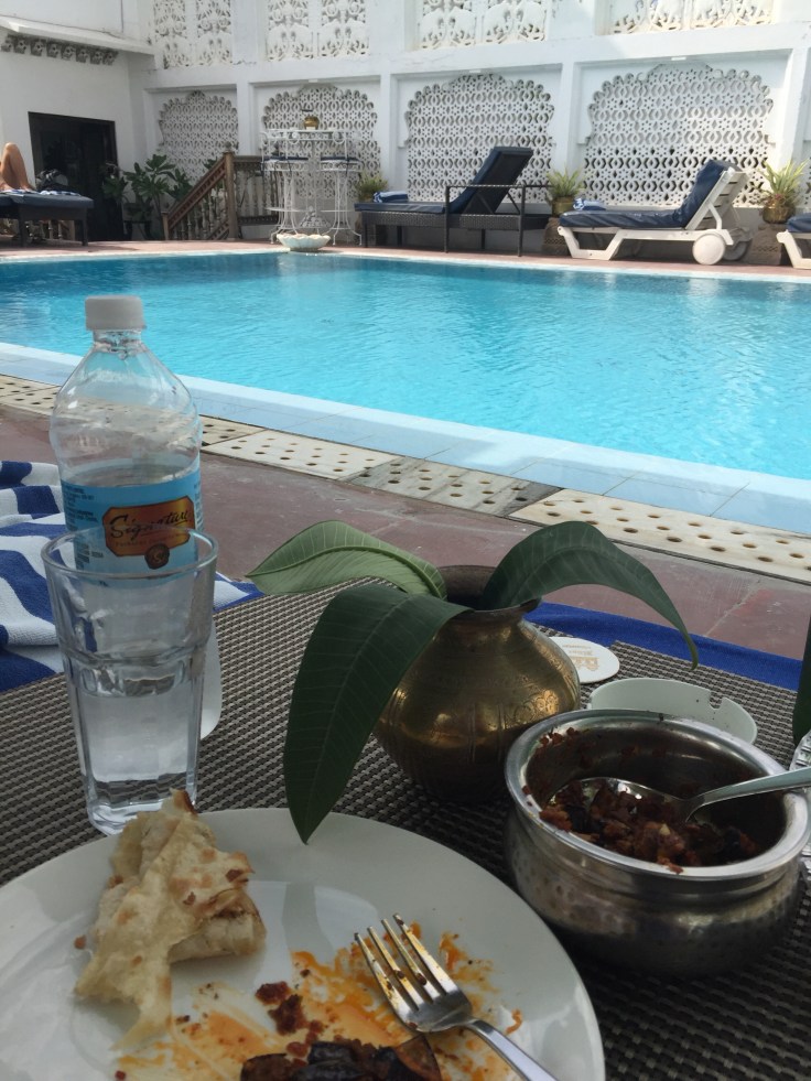 I “ditched” my group and spent a day at a swimming pool at a fancy hotel. It cost $8.50. I had a lovely lunch of eggplant with Marsala seasoning. This is the most popular food additive in India. It has a “kick” and warms up your mouth but is just delicious, especially when you scoop the food up with your naan: