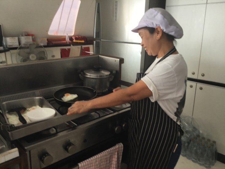 Our crew consisted of a Captain /Skipper, Chef and one assistant. Our Chef, Su cooks up the most amazing meals. Here she is hard at work on breakfast while we sip our coffee Americano and look out on the sea.