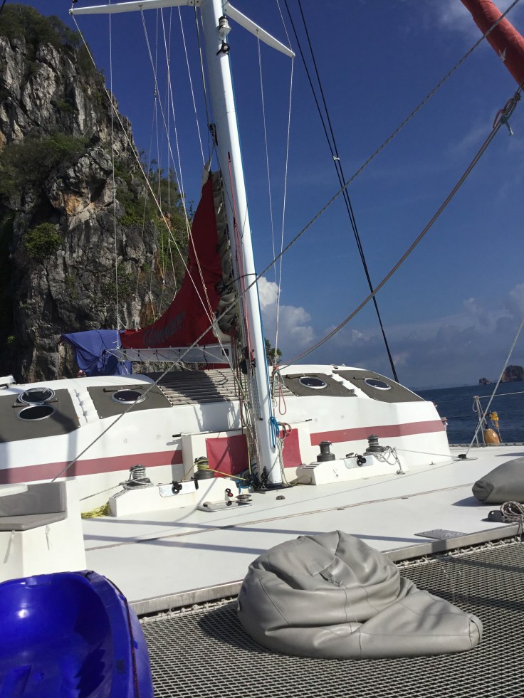 Saturday morning I left J, J, J & M in Bangkok and flew to Phuket to meet up with my sailing buddies at the Yacht Haven Marina. After a little “meet and greet” with the tour guide and group we went aboard our 82 foot catamaran. There were only 10 of us (two couples and eight singles). Half from the USA. We were able to have our own room with en-suite bath and air conditioning. The living area is spacious and the front of our boat has great lounging spots with bean bags for chilling out.