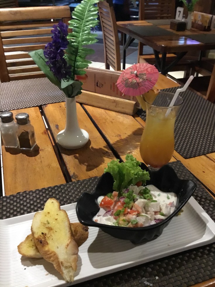 The first night I tried the local fish dish: Kokomo. This is Pacific fish in a coconut cream and lime marinade. It was delicious and went great with a “Sneak to the Beach” cocktail .
