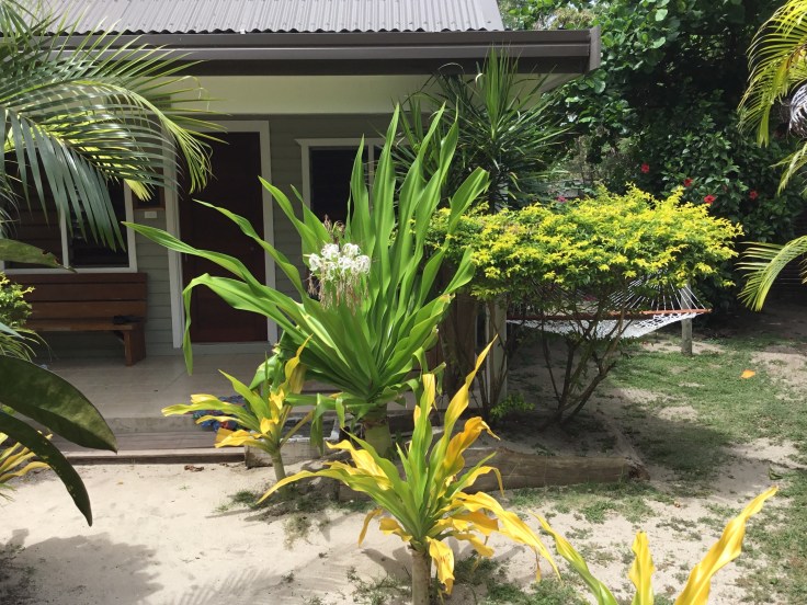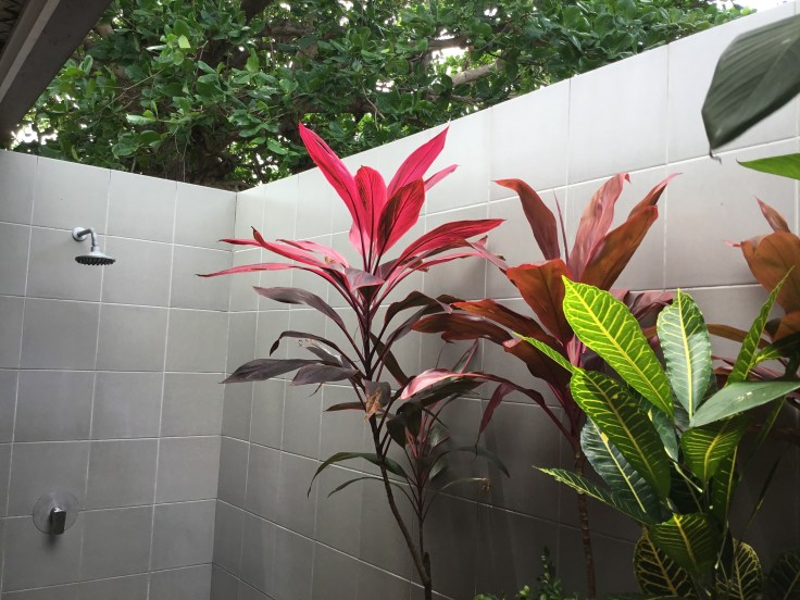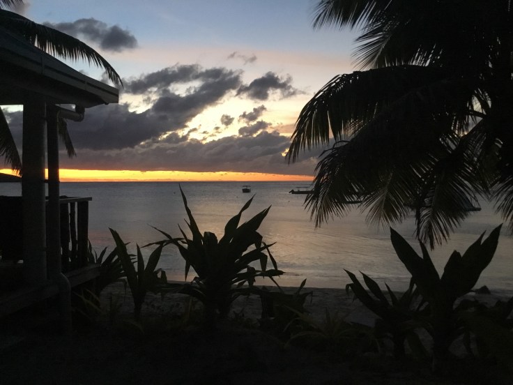 I am living pretty darn large with my outdoor shower and some pretty nice sunset views. The little villa has everything EXCEPT a TV, Radio, clock, air con (which you don’t need) or phone……I am on Fiji time!