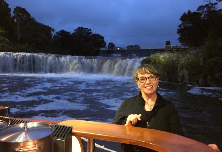 Even bad weather didn’t prevent a dinner cruse on the river with a photo op at the local waterfall. This might look like it is fake but it is real! I’m on the back deck….the pot to my right holds the mussels steaming on the stove. NZ is famous for their green mussels. The shells are a jade like green color but the mussels are large and not one of my favorites.