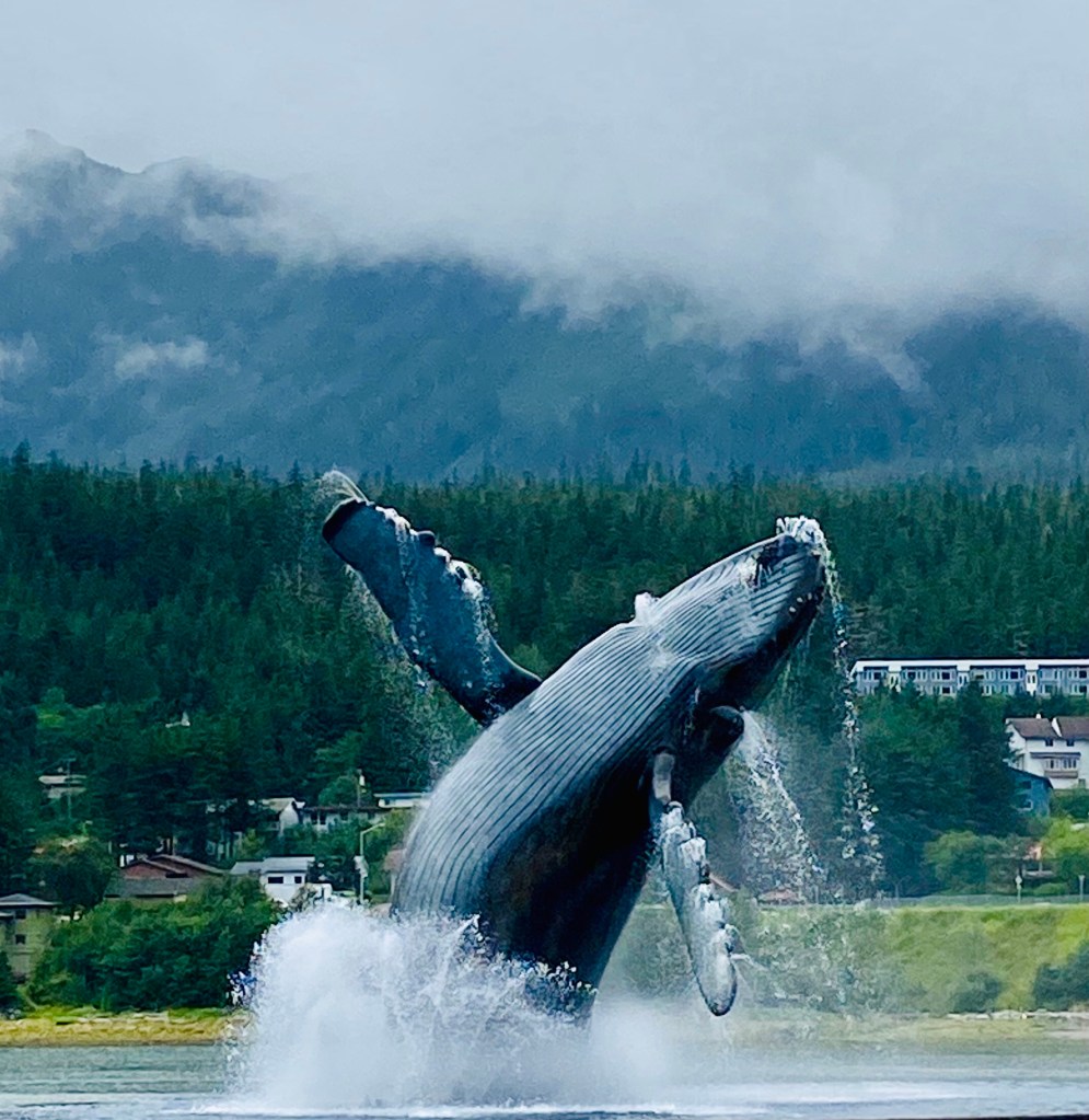 Of course we don’t have waterfalls running down our little mountains. Nor do we have glaciers. In the Juneau area there are about 37 glaciers. The silt and minerals that are constantly flowing into the waterways provide the right environment for salmon to thrive. The abundant of other smaller fish in the inland passage draw the northern migration of whales to Alaska. The whales eat 23 hours/day—little fish: no salmon. They gain about 7 pounds every hour. Most of them leave for breeding in Hawaii and places south as winter approaches. They don’t eat until they get back to Alaska.