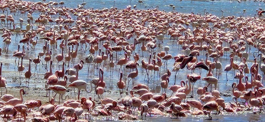 But the most phenomenal sight was a flock of about 200,000 flamingos—mind blowing! They feed in a salt water lake on shrimp. They get their pink from the shrimp. In the first picture there is a little fresh water stream and they go in that to take a bath.