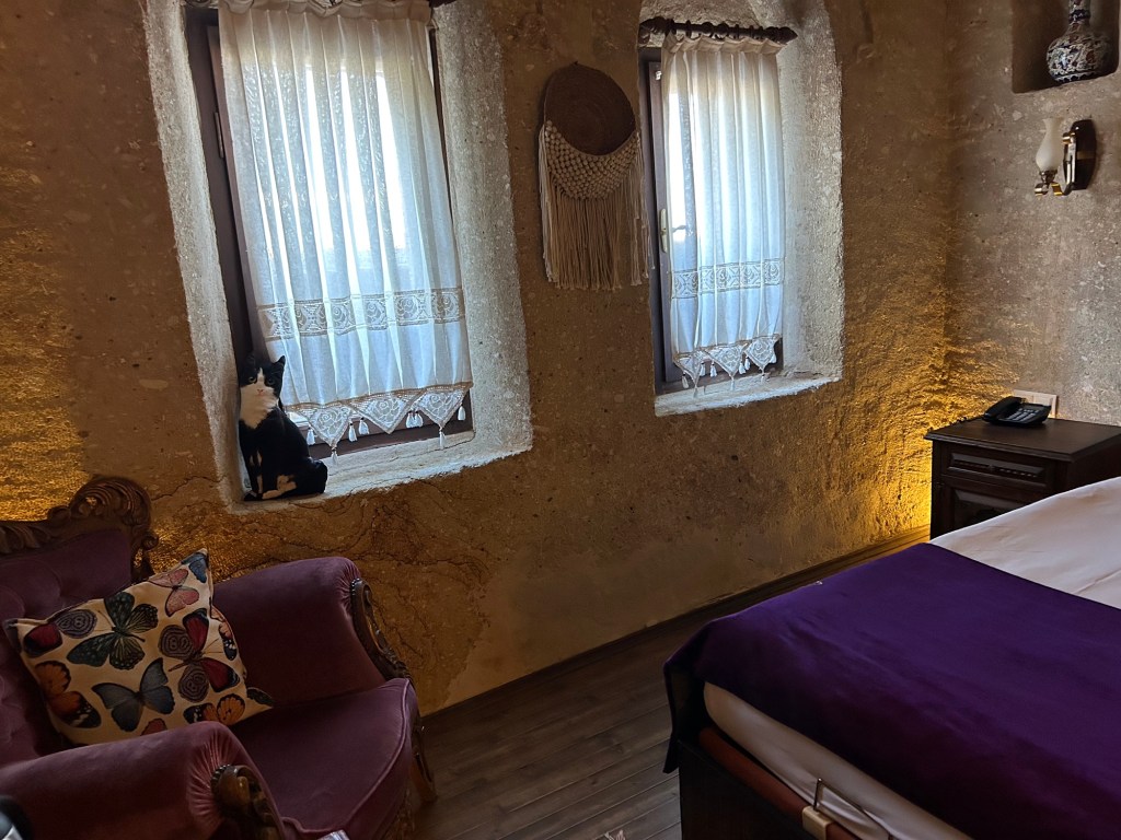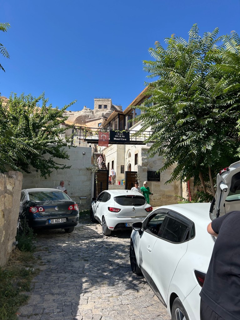 We are staying in a cave hotel at the top of a cobblestone walkway—